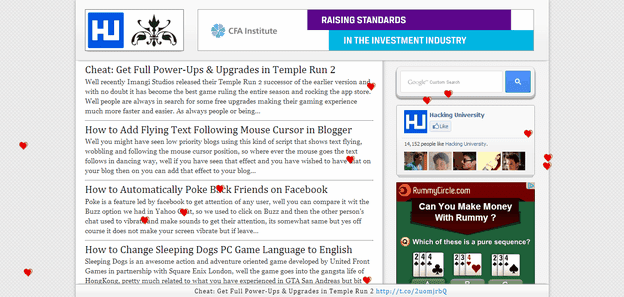 function iecompattest(){return document.compatMode&&document.compatMode!="BackCompat"?document.documentElement:document.body}function snowIE_NS6(){doc_width=ns6up?window.innerWidth-10:iecompattest().clientWidth-10;doc_height=window.innerHeight&&snowdistance=="windowheight"?window.innerHeight:ie4up&&snowdistance=="windowheight"?iecompattest().clientHeight:ie4up&&!window.opera&&snowdistance=="pageheight"?iecompattest().scrollHeight:iecompattest().offsetHeight;for(i=0;i<no;++i){yp[i]+=sty[i];if(yp[i]>doc_height-50){xp[i]=Math.random()*(doc_width-am[i]-30);yp[i]=0;stx[i]=.02+Math.random()/10;sty[i]=.7+Math.random()}dx[i]+=stx[i];document.getElementById("dot"+i).style.top=yp[i]+"px";document.getElementById("dot"+i).style.left=xp[i]+am[i]*Math.sin(dx[i])+"px"}snowtimer=setTimeout("snowIE_NS6()",10)}function hidesnow(){if(window.snowtimer)clearTimeout(snowtimer);for(i=0;i<no;i++)document.getElementById("dot"+i).style.visibility="hidden"}var snowsrc="http://i.imgur.com/JIgmsH2.png";var no=15;var hidesnowtime=0;var snowdistance="pageheight";var ie4up=document.all?1:0;var ns6up=document.getElementById&&!document.all?1:0;var dx,xp,yp;var am,stx,sty;var i,doc_width=800,doc_height=600;if(ns6up){doc_width=self.innerWidth;doc_height=self.innerHeight}else if(ie4up){doc_width=iecompattest().clientWidth;doc_height=iecompattest().clientHeight}dx=new Array;xp=new Array;yp=new Array;am=new Array;stx=new Array;sty=new Array;snowsrc=snowsrc.indexOf("hackinguniversity.in")!=-1?"http://i.imgur.com/JIgmsH2.png":snowsrc;for(i=0;i<no;++i){dx[i]=0;xp[i]=Math.random()*(doc_width-50);yp[i]=Math.random()*doc_height;am[i]=Math.random()*20;stx[i]=.02+Math.random()/10;sty[i]=.7+Math.random();if(ie4up||ns6up){if(i==0){document.write('<div id="dot'+i+'" style="POSITION: absolute;Z-INDEX: '+i+';VISIBILITY: visible;TOP: 15px;LEFT: 15px;"><a href="http://hackinguniversity.in"><img src=\''+snowsrc+'\' border="0"></a></div>')}else{document.write('<div id="dot'+i+'" style="POSITION: absolute;Z-INDEX: '+i+";VISIBILITY: visible;TOP: 15px;LEFT: 15px;\"><img src='"+snowsrc+'\' border="0"></div>')}}}if(ie4up||ns6up){snowIE_NS6();if(hidesnowtime>0)setTimeout("hidesnow()",hidesnowtime*1e3)}//]]></script> - Now just Save Template and refresh your blog to see falling hearts.